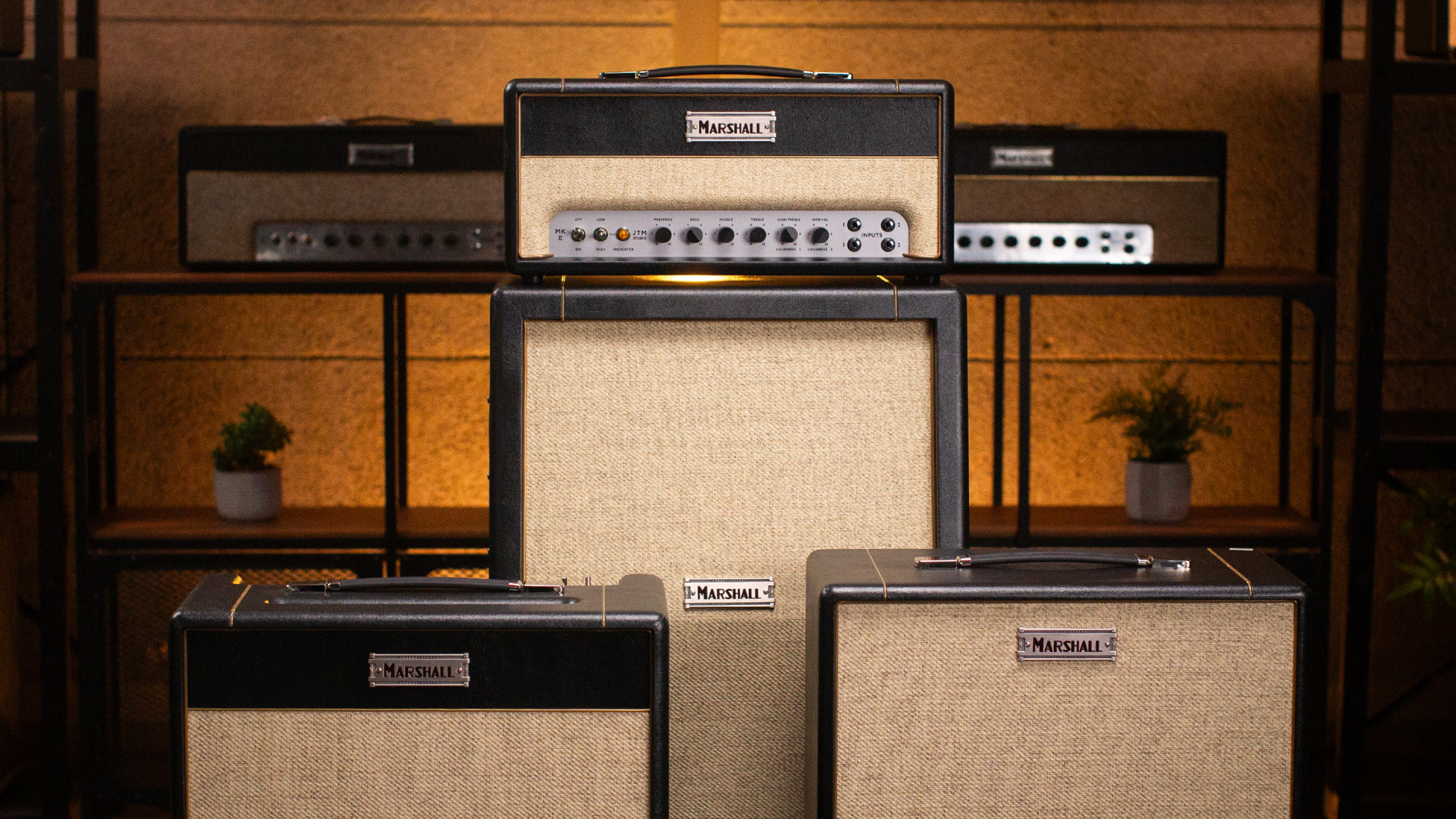 Marshall Studio Vintage Combo amplifiers and guitars on a rug.